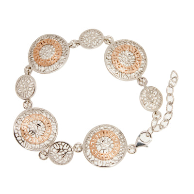Sterling Silver Sterling Silver Rhodium Plated with Rose Gold Plated Accents Greek Key Medallion Bracelet